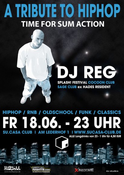 HEUTE - SUCASA!!!!!!!!!! DJ REG!!!!!!!! FREITAG 18.6. A TRIBUTE TO HIPHOP - DJ REG - SuCasa 18. Juni 2010, 23:00 Uhr ########################################### ![]() Yes, he's back! Anfang 2010 rockte DJ REG zuletzt im SU.CASA Club, kehrt er am FR 18.06. wieder zurück! Zum 9. Mal darf bei der "A TRIBUTE TO HIPHOP" mit ihm gefeiert werden und es nimmt kein Ende! Sein unverwechselbares Set aus HipHop/RnB/Classics hat sich im Ulmer Nachtleben sowie bei den HipHop Headz fest etabliert. Die Double-Hour (alle Longdrinks bis 1h für 4,50 €) darf natürlich nicht fehlen darf! Über REG muss man nicht mehr viel Worte verlieren. Er rockt jedes Jahr Europas größte HipHop Festival Splash!, spielt in Helsinki, im SAGE Club, Cocoon - gehört zu den meist verbuchtesten DJs in Europa und macht im Ausland viel von sich reden. Er überzeugt nicht nur musikalisch das Publikum, seine technischen Skillz an den Turntables haben bisher jeden seiner DJ-Kollegen beeindruckt und großen Respekt eingeheimst. Freut Euch auf einen musikalischen Leckerbissen im Black-Music-Bereich! Alle die sich hier bis Freitag, 18.6. (20 Uhr) eingetragen haben, erhalten bis Mitternacht eine Eintrittsermäßigung von 2 Euro! check out: www.bashpartys.de # Events # Dates # Specials # Pixx # DJs |